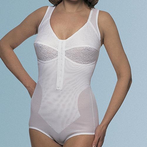 Do you need added suport in your back and shoulders? This firm all-over support body briefer with convenient front closure for easy on and off is your solution! Built-up posture back to gently support your back and shoulders. Hook and eye crotch with cotton shield. Color: White. Sizes: C 38-50; D 36-56; DD 38-54.